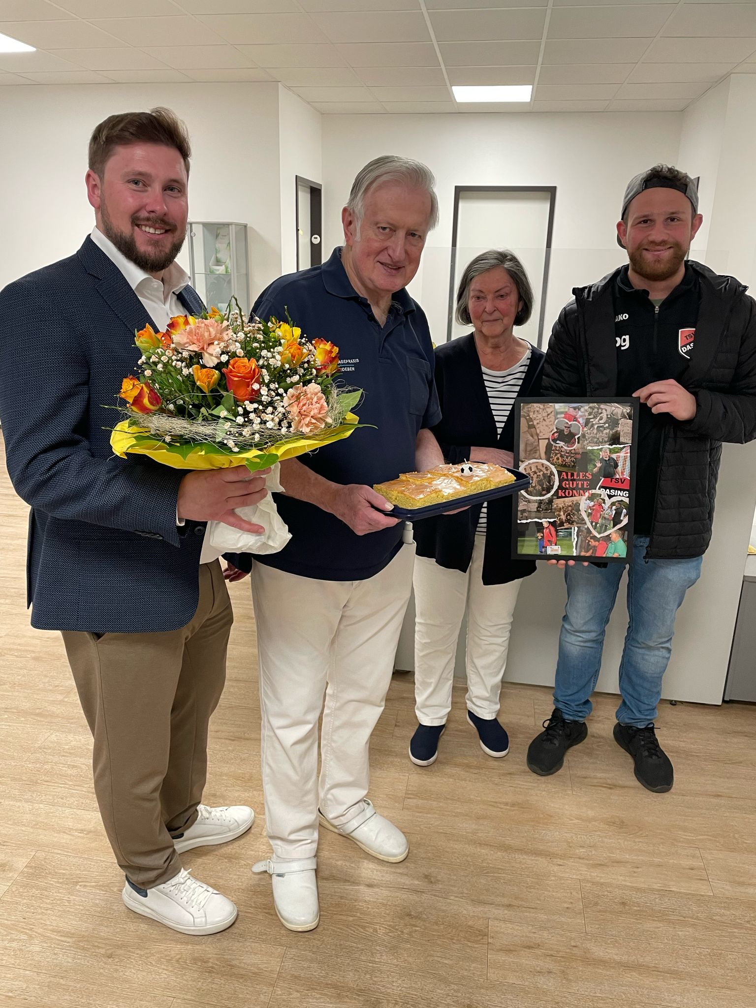 Die Fußballabteilung des TSV Dasing gratuliert herzlich zum „Runden“. Der langjährige Masseur und Wegbegleiter der Dasinger Herrenfußballmannschaft feierte seinen 80. Geburtstag. Abteilungsleiter Andre Rummel und Juniorenleiter Benedikt Greppmair gratulierten Konny Schöben an seinem Jubeltag im Namen der Fußballer herzlich zum Geburtstag und überbrachten neben seinem geliebten „Zitronenkuchen“ ein kleines Präsent – zusammen mit seiner Ehefrau Uschi freute sich der Jubilar über die Überraschung in seiner Praxis.